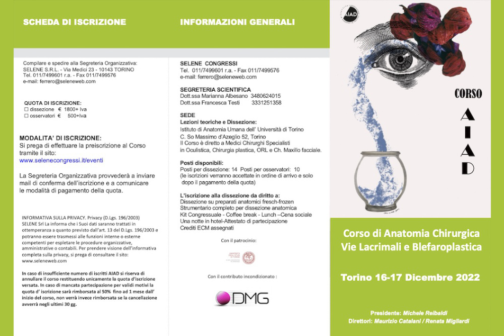 Nel 2022 nasce questo corso «Hands-on sulla chirurgia delle vie lacrimali e sulle tecniche di Blefaroplastica indirizzato agli specialisti che già si occupano di questa chirurgia e vogliono migliorare le loro «skills» individuali o a coloro che vogliono approcciare per la prima volta queste tecniche.